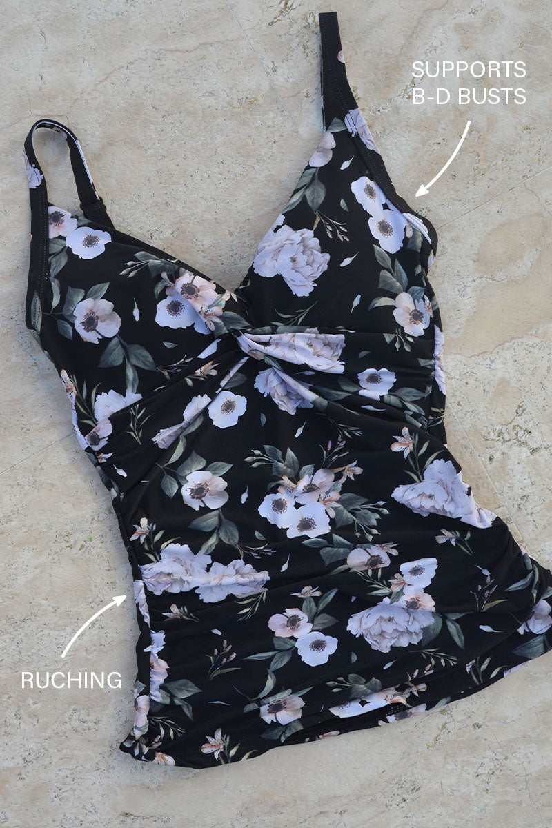 Looped front this tankini top has fabric that loops around at the centre of the bust line. This creates a soft and flattering neckline while giving extra support under the bust, is a multifit design and offers body sculpting attributes of internal powermesh and front panel ruching.